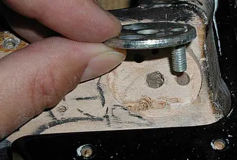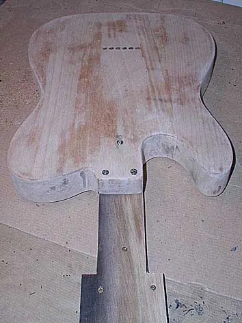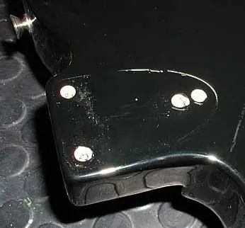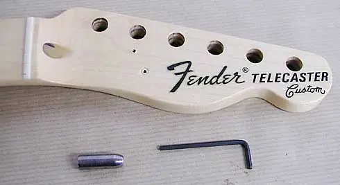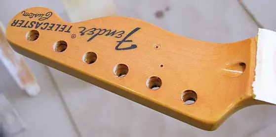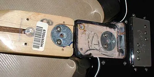 Esto es bien sencillo, pero sólo es por recordar que antes de decapar hay que retirar todas las piezas que no queramos que el producto pueda dañar (ojo con las piezas de plástico!!!, golpeador, mandos y demás). Los que no hayan desmontado nunca una fender de tres tornillos en el neckplate verán que el tercer tornillo es de rosca métrica. Luego veréis lo que es el mircotilt y ese agujerito pequeñito que véis donde “no hay nada” aparentemente.