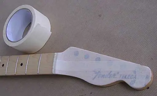 Por el lado delantero primero protegí los trastes con cinta de carrocero (sólo los trastes) antes de lijar. La superficie debe quedar perfectamente lisa para recibir la nitro. Aquí vemos el lado delantero del mástil, donde podemos observar que en el lado delantero de la pala no hemos decapado ni lijado, para conservar la calca original: