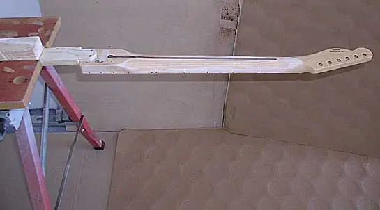 Me hice con un listón en el que tallé la curva para ponerlo atornillado donde va la chapa del Micro Tilt en el mástil, y así poder manejar mejor el mismo para lacar por delante y por detrás en una sola operación: