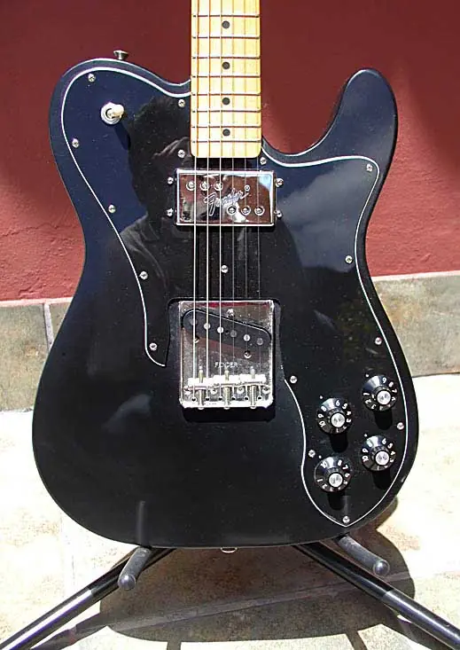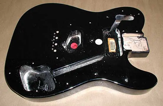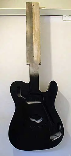 El procedimiento que seguimos ahora con el cuerpo es el mismo que con el mástil, pero sólo con laca transparente sobre el color negro no necesitamos usar laca “envejecida” de distintos tonos ya que sobre el negro no se nota el efecto de amarilleamiento de la nitro, salvo que estemos intentando conseguir un efecto Relic de verdad. Nosotros andamos detrás de un acabado NOS (New Old Stock). Esta es la guitarra terminada y montada lista para sonar: