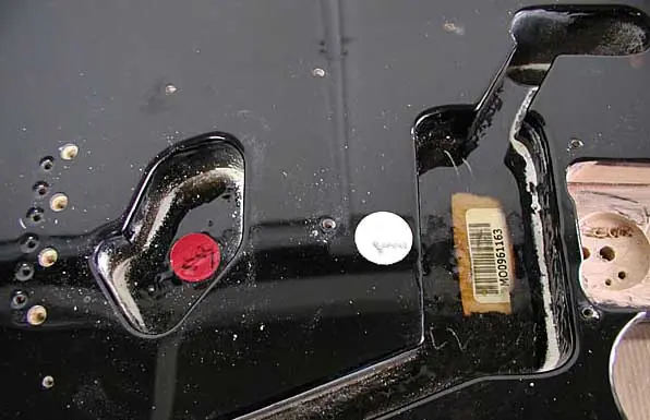 Curiosamente ponen un código de barras que cubren con cinta de carrocero antes de pintar los cuerpos. Esta cinta de carrocero la retiran antes de la laca final, para que no podamos simplemente arrancarla y que quede debajo del barniz. Supongo que es para poder inventariar el cuerpo desde que la máquina lo corta y está listo para pasar a la zona de pintura en la fábrica