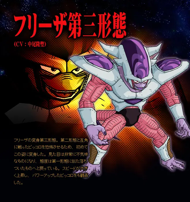 Tercera forma (第3形態, Dai san Keitai?): su cuerpo se encorva y su cabeza se vuelve alargada a la altura posterior del cráneo, muy probablemente como referencia a un Xenomorph, sus cuernos se recubren de coraza orgánica y le aparecen dos más, además de púas en la espalda. Su nariz desaparece por completo. Su velocidad se incrementa bastante, pero no parecía más fuerte. Esto se noto cuando Son Gohan lo ataca por segunda vez hacia la corteza del planeta, asustando a Freeza, dando por resultado a que demostrara su verdadero poder.
