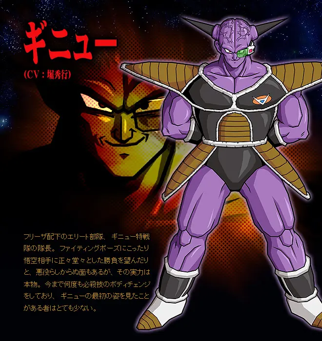 Ginyu (ギニュー, Ginyu?) es un soldado a las órdenes de Freeza. Su nombre proviene de una deformación del japonés Gyūnyū (牛乳, Gyūnyū? Leche), es el líder y el más poderoso de los cinco guerreros y de todos los soldados de Freeza.