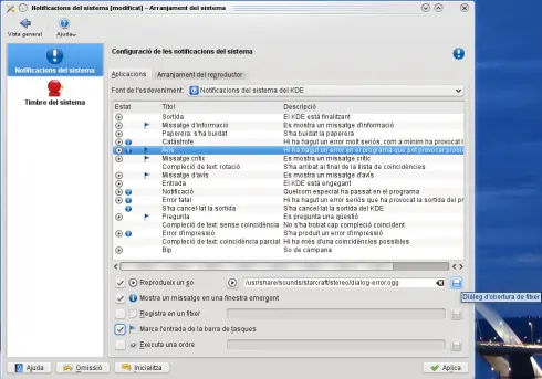 En este módulo disponemos de una gran lista desplegable de aplicaciones y las distintas acciones que podemos hacer con ellas. Seleccionamos Notificaciones del Sistema KDE.