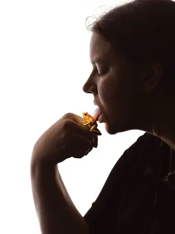 Clark olisquea para detectar toxinas antes de lamer; una rana dardo venenosa en estado salvaje sería demasiado potente para una prueba degustativa. Este espécimen criado en cautiverio come diferentes alimentos, lo cual lo hace seguro para probar.