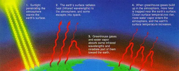 La razón de esta discrepancia de temperatura, es que la atmósfera es casi transparente a la radiación de onda corta, pero absorbe la mayor parte de la radiación de onda larga emitida por la superficie terrestre. Varios componentes atmosféricos, tales como el vapor de agua, el dióxido de carbono, tienen frecuencias moleculares vibratorias en el rango espectral de la radiación terrestre emitida. Estos gases de invernadero absorben y reemiten la radiación de onda larga, devolviéndola a la superficie terrestre, causando el aumento de temperatura, fenómeno denominado Efecto Invernadero (GCCIP, 1997).