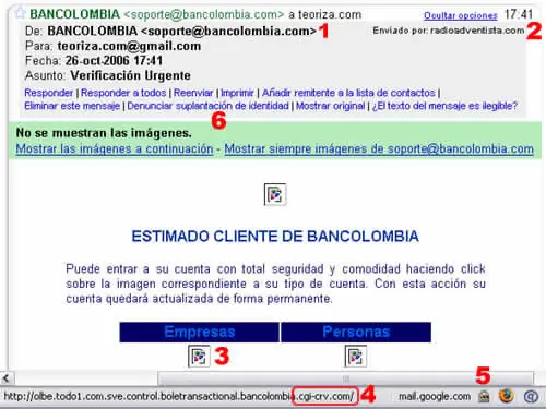 La dirección del email (1) parece que proviene de Bancolombia, pero este punto forma parte del engaño. En realidad es un dato falseado, el email NO proviene del dominio “bancolombia.com”.
