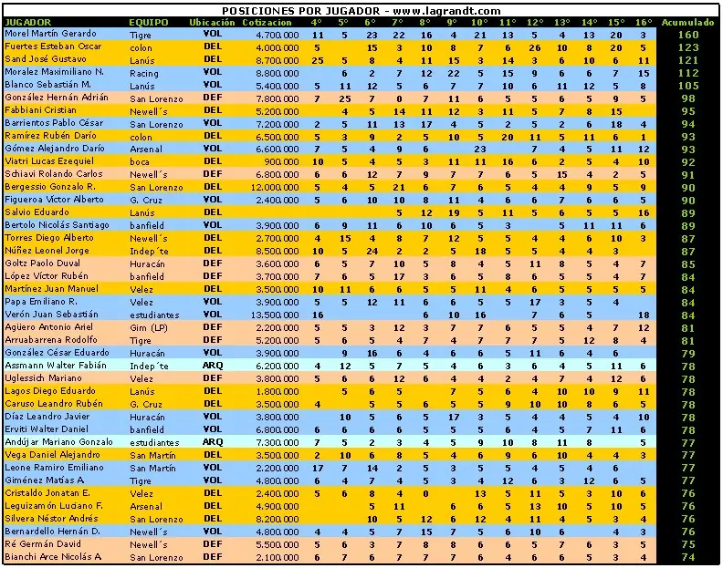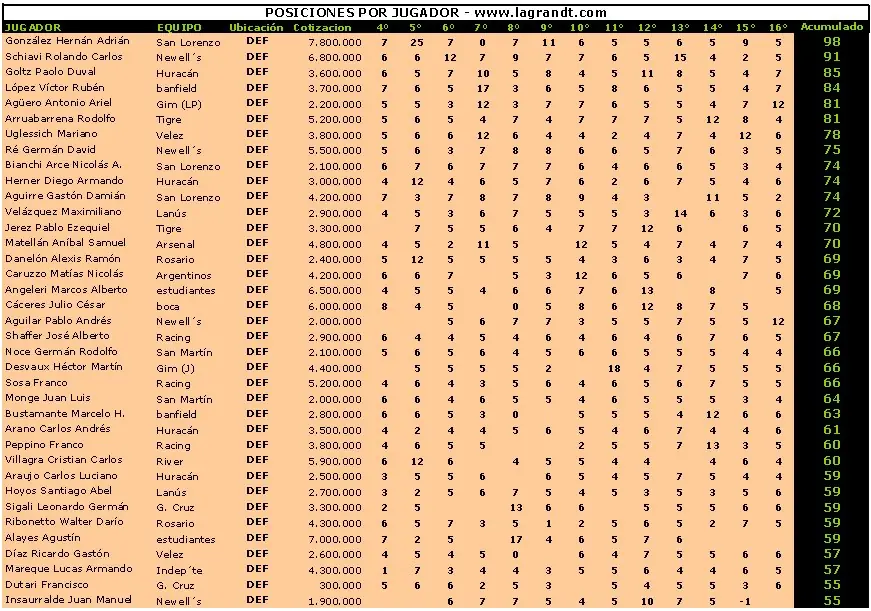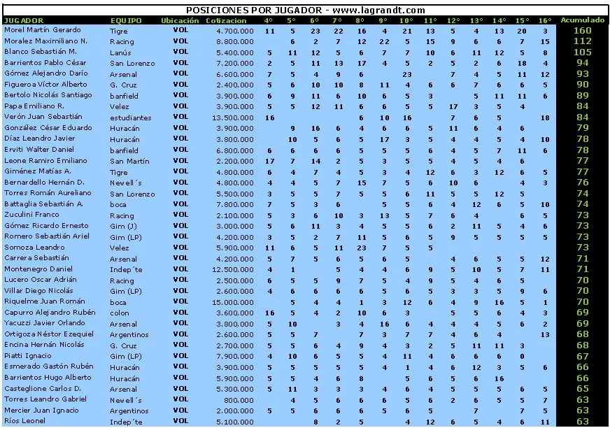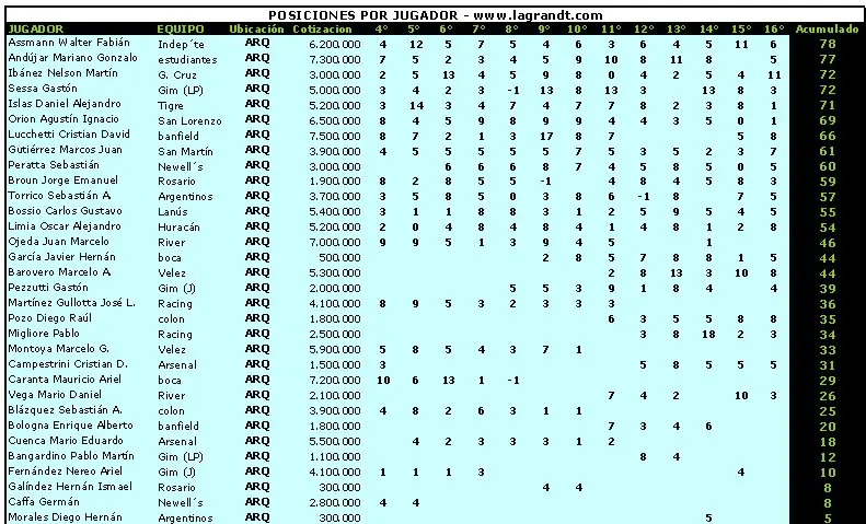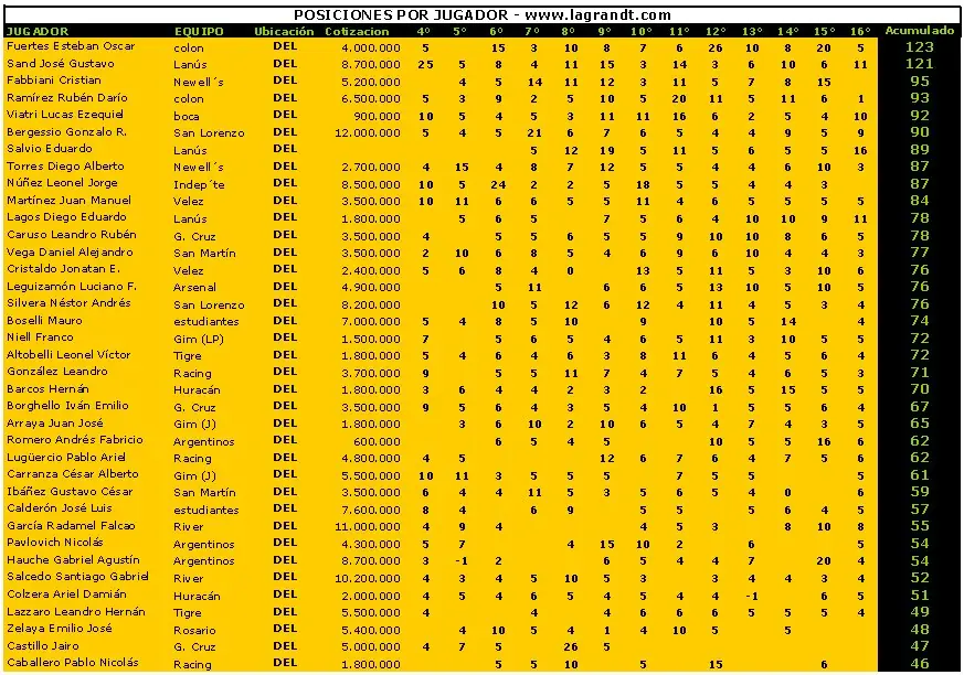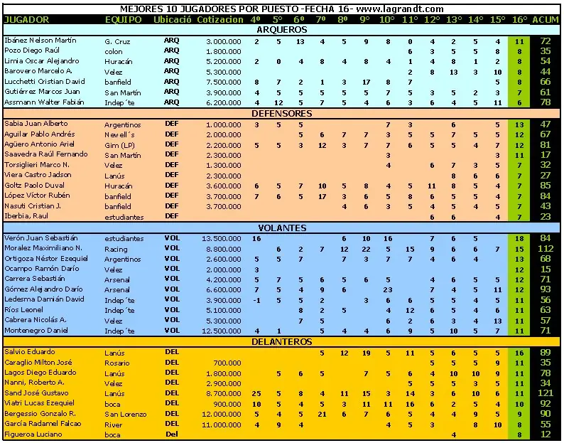 ACUMULADAS MEJORES POR PUESTO A LA FECHA 16
