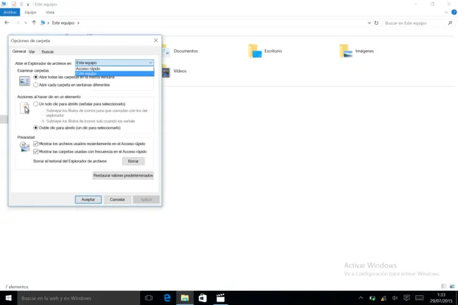 y en la pestaña General vamos hasta Abrir el Explorador de archivos en: y seleccionamos Este equipo
