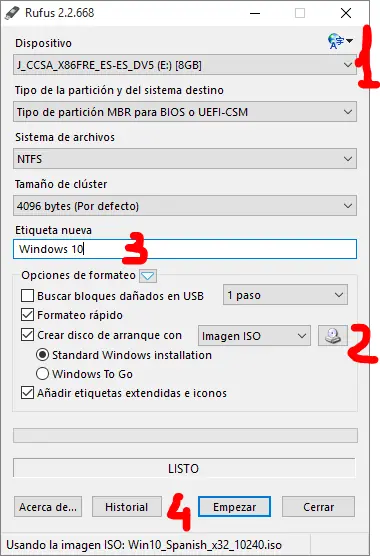 Para tal tarea utilizaremos el programa RUFUS previamente descargado. Los paso para la creación del instalador usb son muy sencillas: