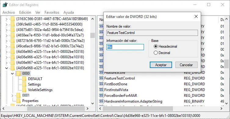 ☼ En la entrada "FeatureTestControl" cambiamos 184 por FFFE