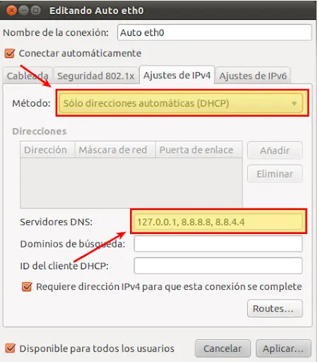 2.- Servidores DNS 127.0.0.1, 8.8.8.8, 8.8.4.4