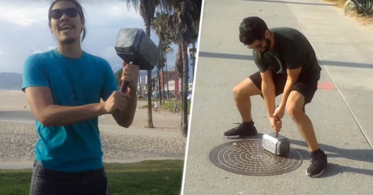 En el video que verás a continuación, toda clase de personas intentan levantar el martillo sin éxito. Niños, adultos y musculosos, y ninguno es capaz de moverlo ni un solo milímetro. Sólo su creador, un tipo flacucho, que consigue despegarlo para el asombro de todos.