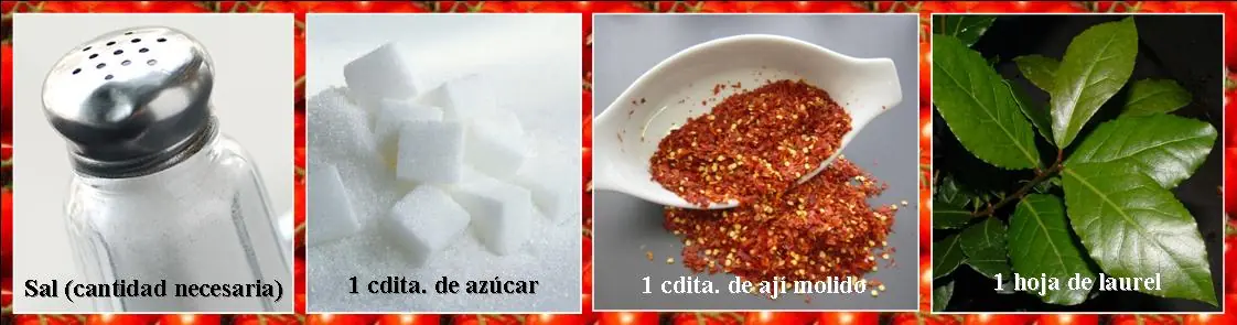Sal, 1 cdita. de azúcar, 1 cdita. de ají molido, 1 hoja de laurel