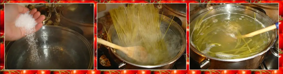 Pelar los 6 dientes de ajo, calentar 2 cdas. de aceite en una cacerola pequeña. Dorar los dientes de ajo en el aceite. También calentar 5 litros de agua en una cacerola grande para luego cocer la pasta.