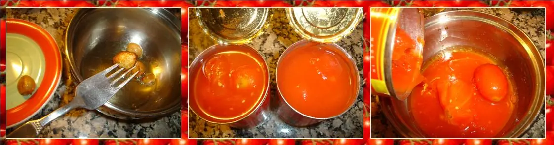 Retirar los ajos del aceite sin dejar que se tuesten demasiado (la salsa queda más suave si los quitamos). Agregar el contenido de 2 latas de tomates perita sin piel y llevar al fuego.