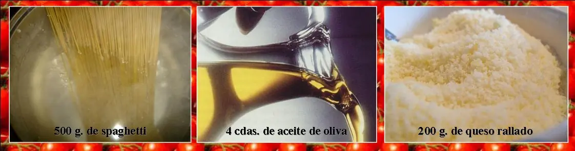 500 g. de spaguetti secos, 4 cdas. de aceite de oliva, 200 g. de queso rallado