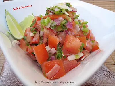 Bueno no es mucha ciencia, se deben cortar los pimientos, los tomates y la cebolla en pequeños trozos, o para los q saben en corte brunoise, luego de esto debe colocarse todo en un recipiente, agregar aproximadamente media taza de vinagre, 2 cucharadas grandes de aceite (yo uso de girasol), y sal a gusto.