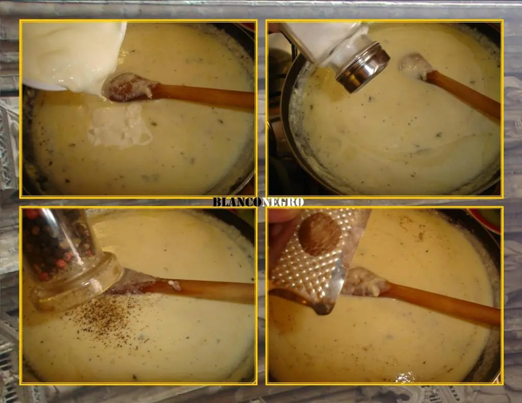 Continuar la preparación de la salsa añadiendo 150 c.c. de crema de leche (nata). Condimentar con sal, pimienta molida, y nuez moscada.