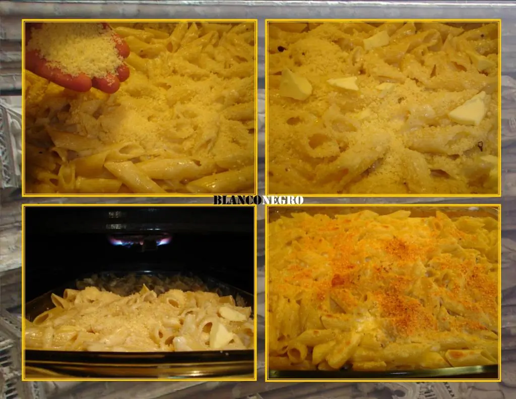 Colar los macarrones cocidos “al dente” y distribuirlos en una fuente para horno enmantecada,. Verter encima la salsa y mezclar.
