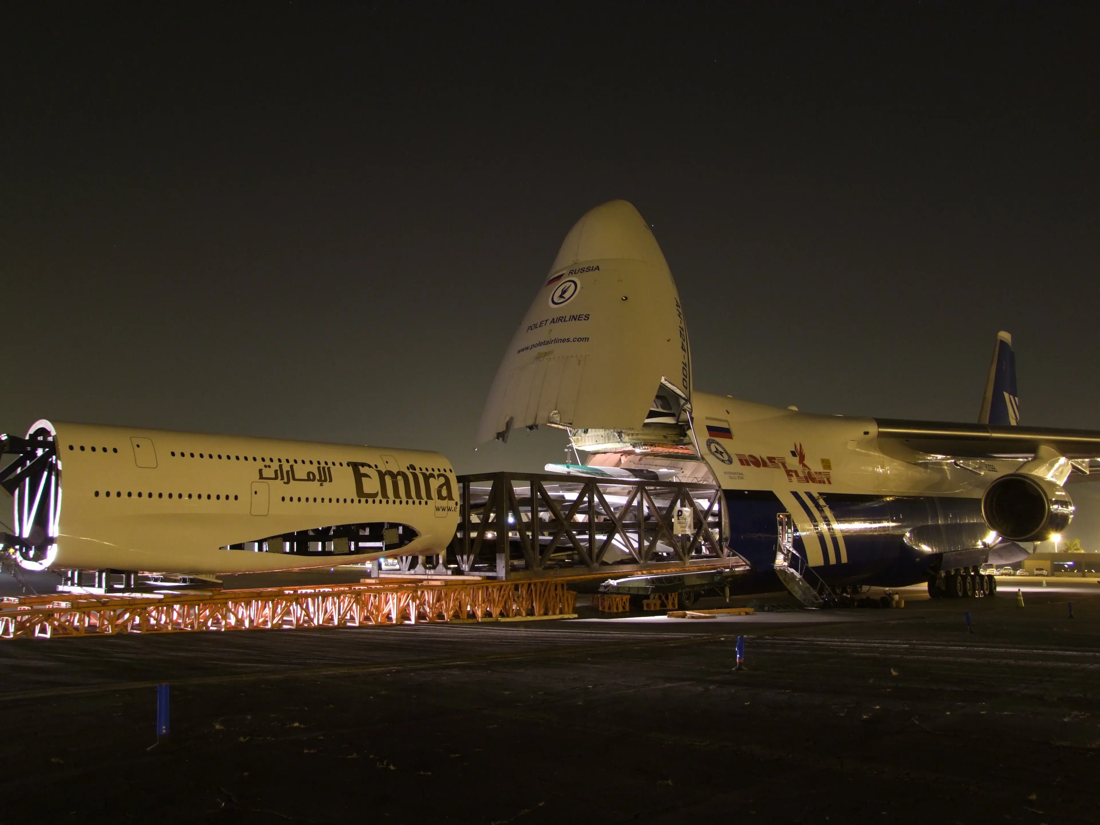 El Antonov An-124 Ruslan (designación OTAN: Condor) fue el avión más grande construido en serie hasta la llegada del Airbus A380 y fue, hasta la llegada del An-225, el avión más grande fabricado. Durante su desarrollo era conocido como An-400 y An-40 en Occidente y realizó su primer vuelo en 1982. Hay más de cuarenta aviones en servicio, 26 de ellos con aerolíneas, en los Emiratos Árabes Unidos, Libia, Rusia y Ucrania. Físicamente, el An-124 es similar al Lockheed C-5 Galaxy estadounidense, pero ligeramente mayor. Los An-124 han sido utilizados para transportar locomotoras, yates, fuselajes de aviones y otros tipos de carga de grandes dimensiones. El avión puede inclinarse para facilitar la entrada del cargamento. Un An-124 militar puede llevar hasta 150 t de carga, también puede llevar hasta 88 pasajeros en una cubierta superior detrás de la cabina. Sin embargo, debido a la limitada presurización del fuselaje, raramente transporta a paracaidistas.El An-124 fue fabricado en paralelo por dos fábricas: la compañía rusa Aviastar-SP (antiguo Complejo de Aviación Industrial de Ulyanovsk) y la fábrica AVIANT de Kiev, en Ucrania. La producción se detuvo tras la desaparación de la Unión Soviética. Las últimos cinco estructuras básicas sin terminar fueron completadas entre 2001 y 2004. Aunque ya no se fabrican An-124, existen planes comunes entre Rusia y Ucrania para volver a producir aviones entre 2008-2009. Ya que el avión fue diseñado inicialmente para uso militar ocasional, los An-124 originales se fabricaron con una vida útil de 7.500 horas de vuelo con la posibilidad de una extensión. Sin embargo, muchos aviones han volado más de 15.000 h de vuelo. Como respuesta a las quejas de los clientes comerciales, los aviones fabricados después de 2000 (el An-124-100) tienen una vida útil de 24.000 h, mientras que los modelos antiguos se están actualizando al nuevo estándar. Alemania lideró el esfuerzo de alquilar aviones An-124 para las necesidades de transporte aéreo táctico de la OTAN. Los dos aviones fueron alquilados a SALIS GmbH como un recurso provisional hasta la llegada del Airbus A400M La compañía de carga rusa Volga-Dnepr tiene contratos con Boeing para transportar componentes aeronáuticos de gran tamaño a su fábrica de Everett. El An-124 es el único medio para transportar el turbofan General Electric GE90 completamente montados, los motores utilizados en el Boeing 777. Airbus ha seleccionado otra compañía de transporte rusa, Polet Airlines como «transportista designado» para la empresa. Polet espera que sus tres An-124-100 transporten equipo astronáutico fabricado por EADS, que posee el 80% de Airbus, y componentes de un modelo del Airbus A380.[4] Como el Rolls-Royce Trent 900 es el único motor del A380 que puede ser transportado entero en un Boeing 747F, su competidor, el Engine Alliance GP7000 necesita un avión más grande, como el An-124, si se quiere transportar en una sola pieza.