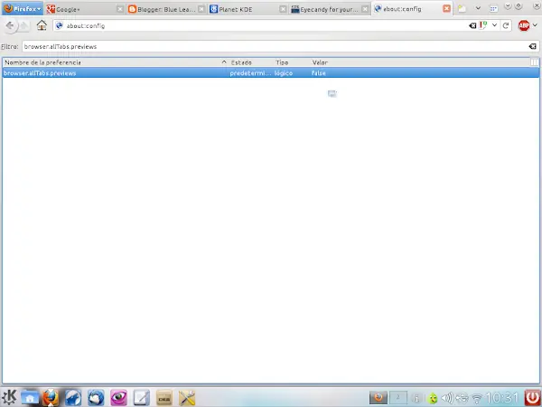 Una vez en las configuraciones avanzadas de Firefox , procedemos a buscar el campo "browser.allTabs.previews" y damos doble click sobre el valor "false" para cambiarlo a "true".
