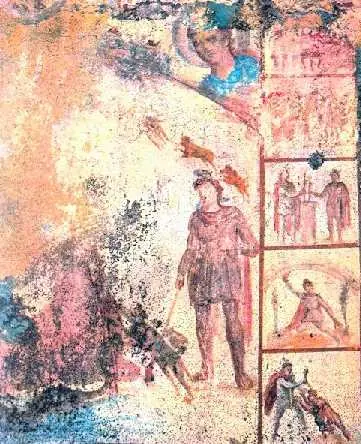 Luego sigue la descripción del diluvio: "Habiéndose disipado las tinieblas, el barco se quedo en tierra. Entonces la vaca blanca, que se había transformado en hombre, salió del navío y las otras vacas salieron con él".