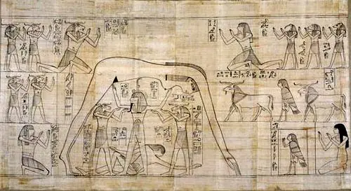 "He aquí que una vaca nació de la tierra, y esta vaca era blanca. Después siguió una ternera y con ella otra ternera. Una era negra y otra era roja. Después, una de estas terneras fue a las vacas blancas y las enseño un misterio. Mientras que la vaca temblaba se convirtió en un hombre que construyo un gran barco donde vivió con tres mujeres".