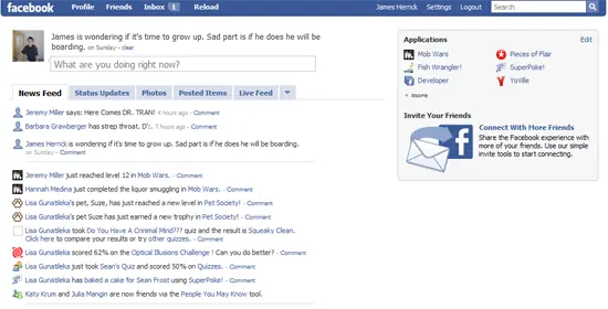 Facebook Refresh 2 - Aún en Alpha, Facebook Refresh 2 se carga automáticamente a su feed de noticias, actualizaciones de estado de inicio al costado y el número de mensajes en la barra de navegación cada 30 segundos. Eventualmente también para hacer esto en el muro y la bandeja de mensajes.
