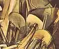 Desnudo bajando una escalera, 1912.Retirado de los Independientes de 1912 y aclamado el año siguiente en Nueva York, este cuadro establece ya claras distancias entre Duchamp y el cubismo.
