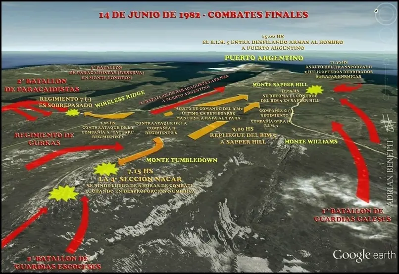 Los batallones de paracaidistas británicos y regimientos escoceses, y el 42 y 45 Comando iniciaron su avance contra las posiciones de los regimientos 4 de Monte Caseros, 6 de Mercedes y especialmente contra las unidades del 7 de La Plata y del BIM 5 en esas montañas. El fuego alcanzó el casco urbano de la capital malvinera. Nuestro grupo pasó esa noche en un galpón con forma de hangar en los bordes de lo que constituían las últimas casas de las afueras de Puerto Argentino, debido a que tuvimos que abandonar las posiciones frente al mar a causa de las lluvias que habían inundados nuestras trincheras días antes. Entre explosión y explosión salimos todos de regreso hacia las posiciones contiguas al mar y al monte Sapper Hill.