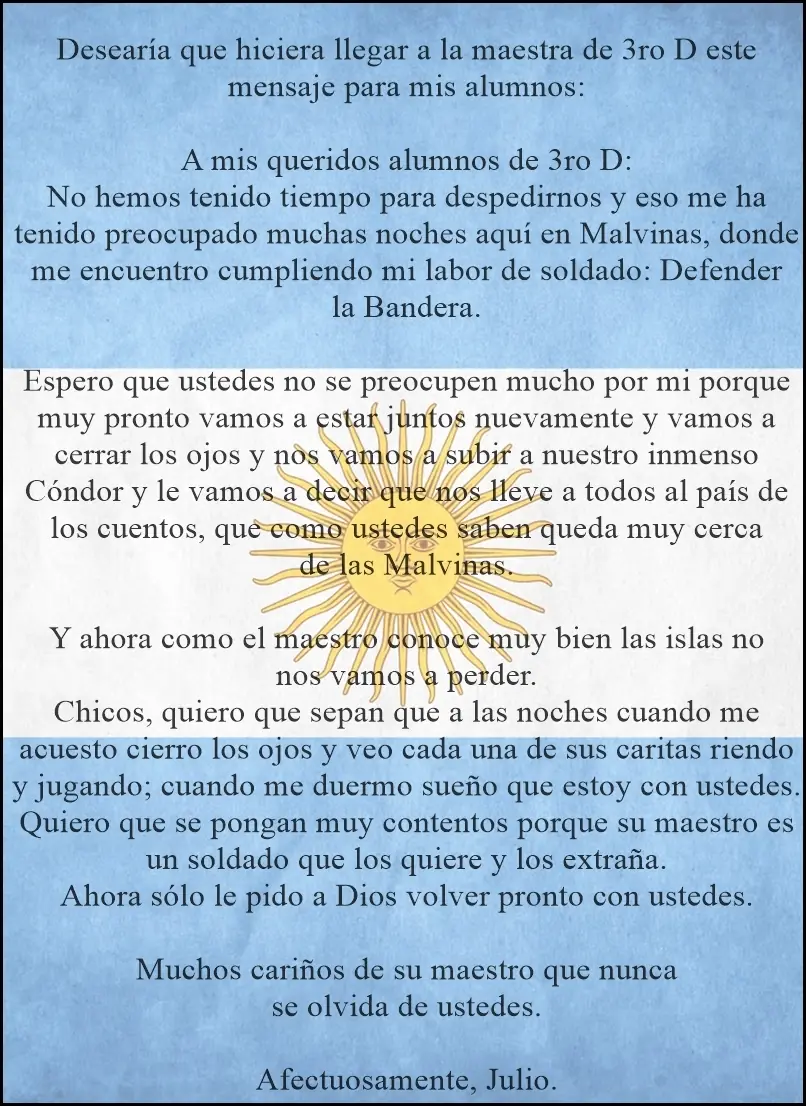 Durante la espera en las Islas, Julio dedicó parte de su tiempo a escribirle cartas a sus alumnos de primaria, las cuales serán expuestas a continuación