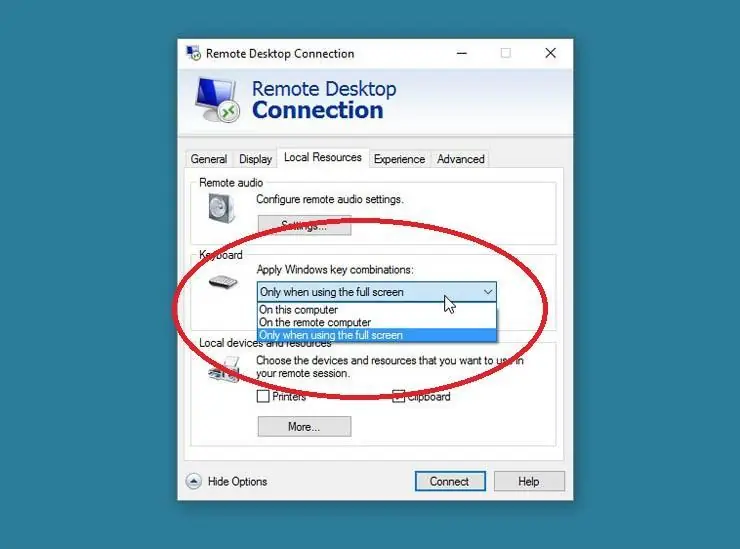 En la ventana de Recursos Locales puedes configurar los ajustes de audio remoto y elegir cuándo aplicar combinaciones de teclas.