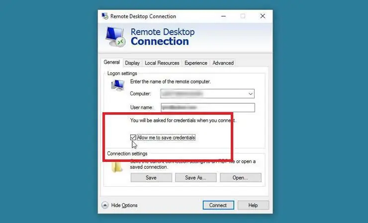 Después de terminar la sesión, abre RDC de nuevo (Win + R> escribe mstsc.exe en la ventana Ejecutar). Haz click en el botón Mostrar opciones. Ahora puedes ajustar configuraciones si lo deseas. En la pestaña General, marca la opción "Siempre pedir credenciales" si no deseas introducir tu contraseña cada vez que te conectes.
