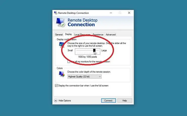 En la ficha Pantalla, puedes cambiar el tamaño de la ventana remota de pequeña a grande.