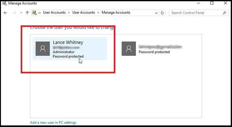 Para comprobar esto, inicia el Panel de control. En el campo Búsqueda de Panel de Control en la esquina superior derecha, escribe la palabra usuarios. En los resultados de búsqueda, haz click en el enlace "Cuentas de usuario". En la ventana "Hacer cambios en su cuenta de usuario", haz click en el enlace "Administrar otra cuenta". Mira las cuentas enumeradas y ve cuál está designada como Administrador.