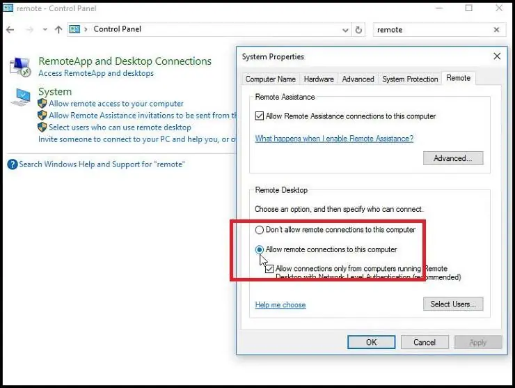 En primer lugar, tú o alguien más tendrá que iniciar sesión físicamente en la PC remota, la PC a la que deseas acceder desde lejos. Inicia el Panel de control. En el campo Búsqueda de Panel de Control en la esquina superior derecha, escribe la palabra remoto. En los resultados de búsqueda, haz click en el enlace "Permitir acceso remoto a su equipo".