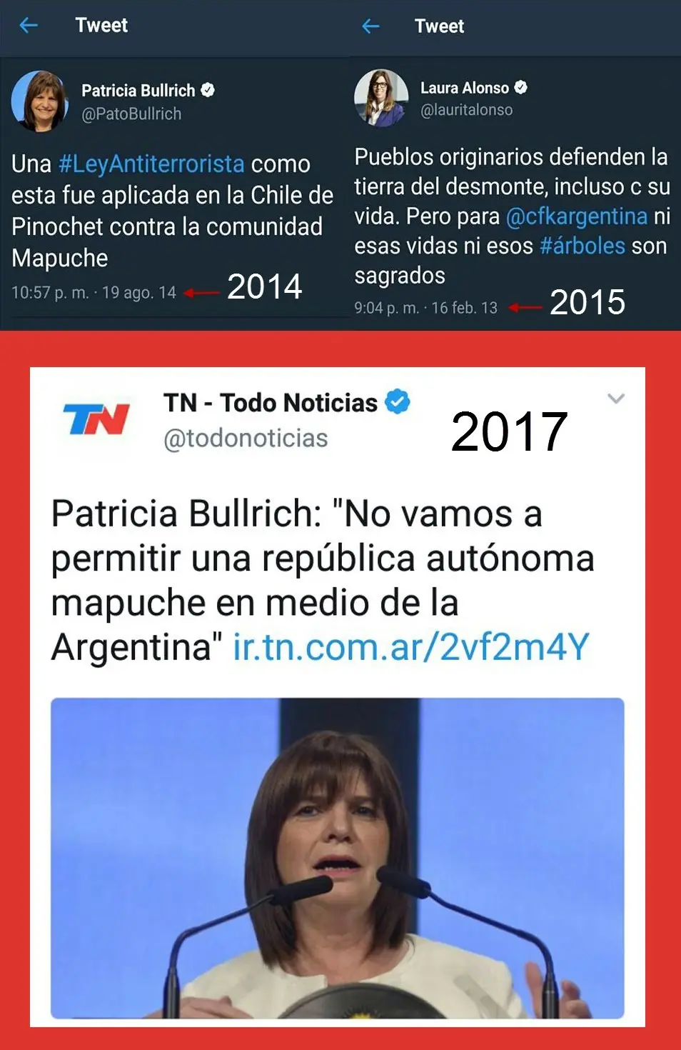La represión de la Gendarmería Nacional en contra de la comunidad mapuche Pu Lof, en el departamento de Cushamen, provincia del Chubut, enfrentada con el empresario italiano Luciano Benetton, propietario de más de 800 mil hectáreas en la Patagonia desde 1991, desató una polémica acerca de la condición "chilena" de los mapuches que habrían exterminados a los tehuelches, "indios argentinos".