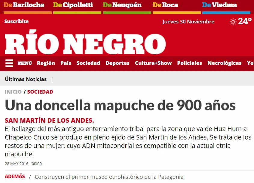 El enterramiento nativo de una mujer que los arqueólogos han dado en llamar “la doncella de los Siete Manzanos”, reveló restos con una datación de 900 años en la zona de Chacra 30 de esta ciudad, y ADN compatible con la actual etnia mapuche, según confirmaron arqueólogos del laboratorio de Etnohistoria del proyecto Lanín-Collón Cura, integrado por la Universidad de Buenos Aires, la Universidad Maimónides y la Fundación Azara, entre otras instituciones.