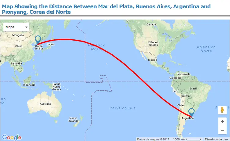 Luego especifica: "El punto de tierra más lejano de Corea del Norte parece ser la ciudad de Mar del Plata, en Argentina".