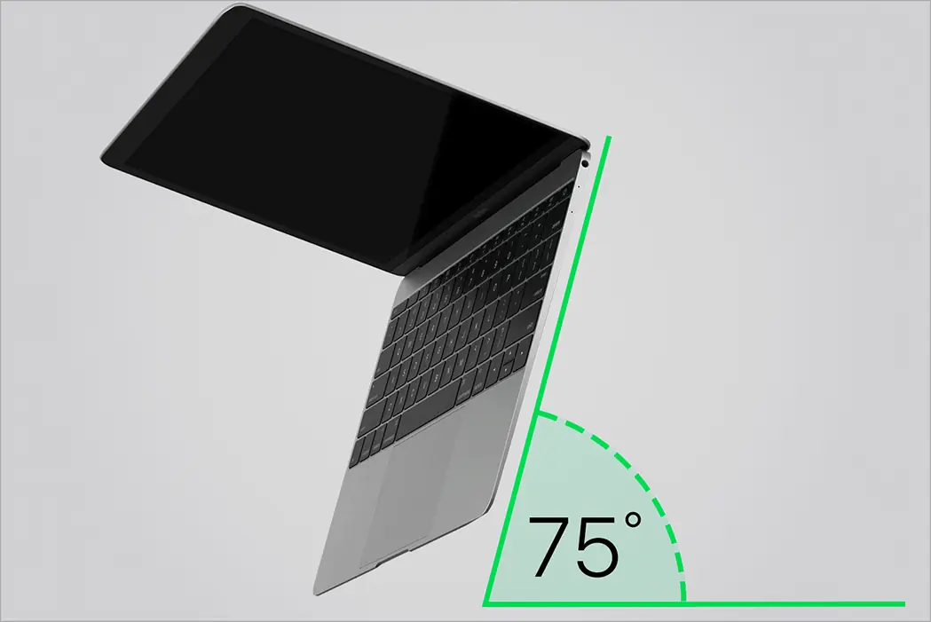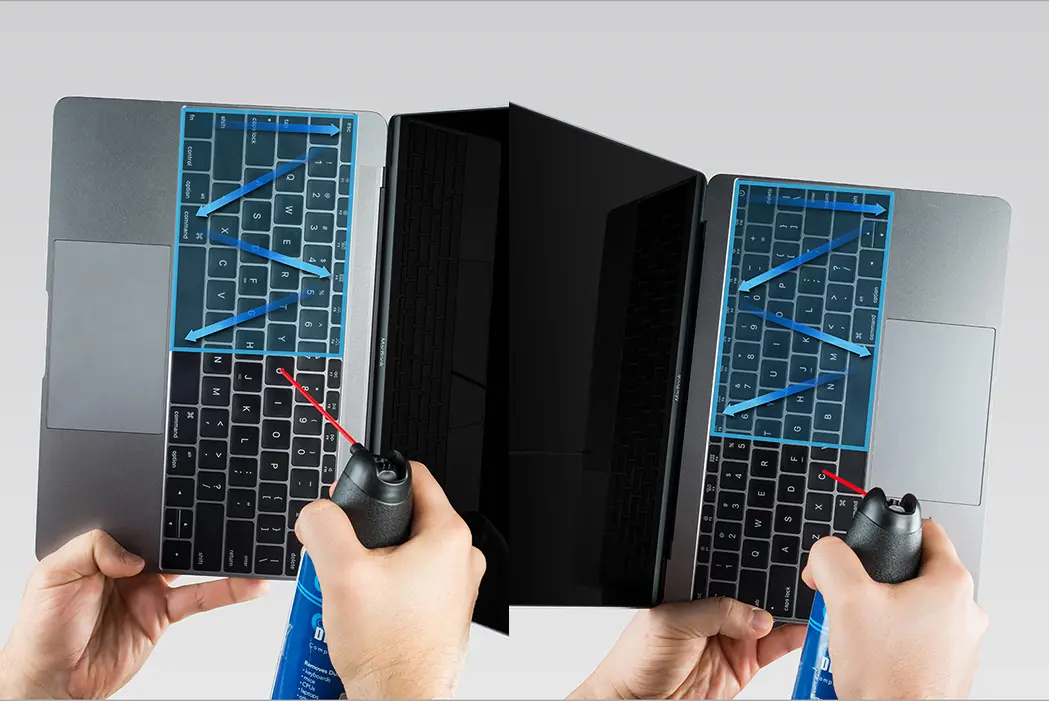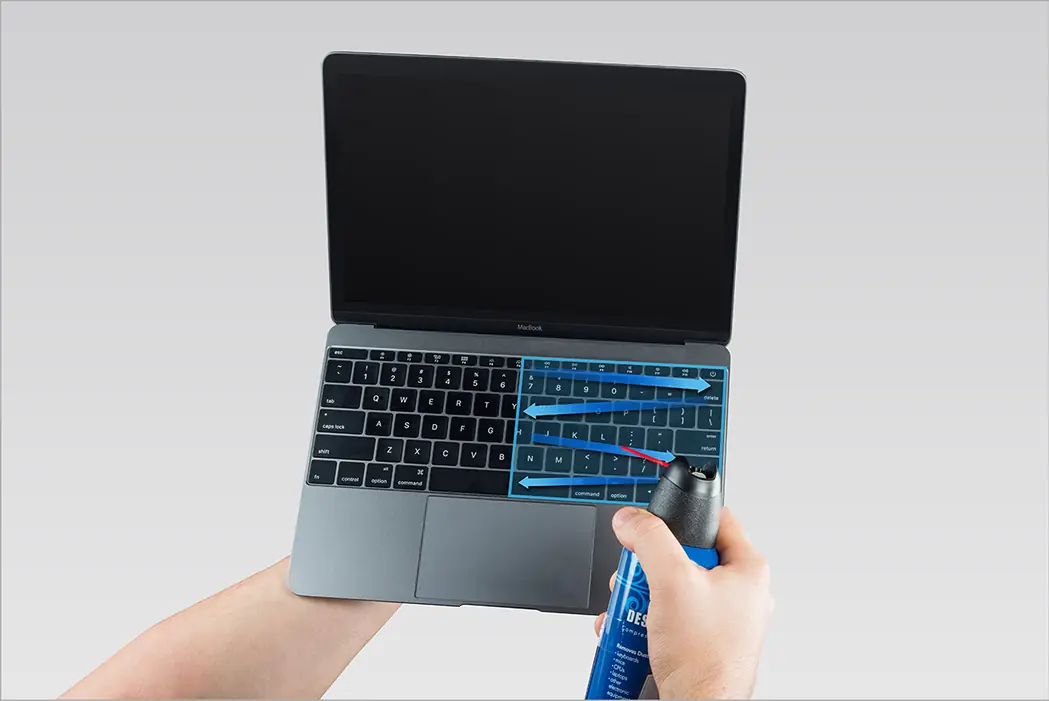 Apple recomienda que si hacemos uso de aire comprimido para limpiar el teclado lo hagamos con una inclinación de 75 grados sobre la normal. Los movimientos, además, deberán ser en zigzag y comenzando siempre desde la izquierda a la derecha y por arriba, como vemos en la imagen inferior.