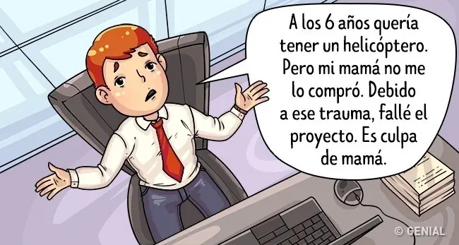 Tu interlocutor tiene justificación para cualquier fracaso suyo o falta de iniciativa. Le echa la culpa a todo el mundo. Si llegó tarde a la cita fue porque el taxista llegó 2 minutos tarde. Si lo dejaron sin premio, fue porque su jefe lo odia. Si la compañera Lucía tiene el sueldo más grande que él, obviamente no es por méritos laborales.
