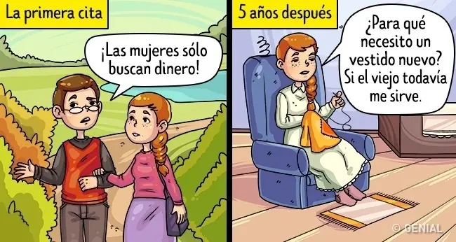 "Las mujeres sólo tienen un objetivo: seducir a un hombre rico y descubrir el código PIN de su tarjeta de crédito". Si el hombre menciona esta idea tan rara, ¡corre! Tal vez sólo esté intentando justificar su avaricia. De acuerdo con su guión, tendrás que demostrar todo el tiempo que no tienes intenciones interesadas.