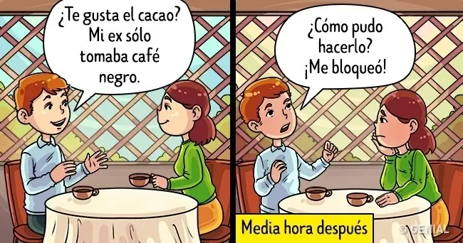 La relación anterior, de por sí, es un tema bastante delicado. Y si la cita se convierte en una sesión de psicoanálisis, ya es un motivo para que te pongas a pensar. Tal vez simplemente esté estancado en un romance fracasado. ¿Estás dispuesta a escuchar durante horas sus quejas?