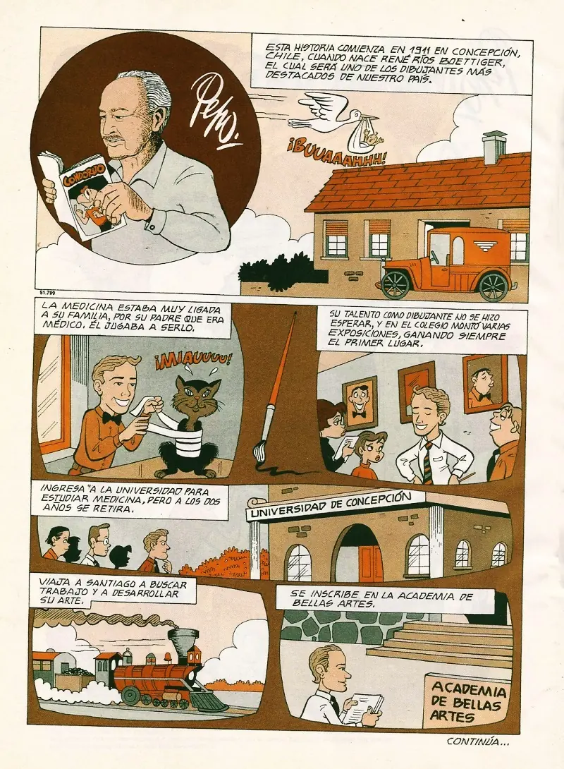 Los invitamos a conocer el origen de nuestro plumífero amigo, en una viñeta recreada por René Ríos Boettiger: Pepo. No sin antes conocer algo de la vida de este destacado dibujante.