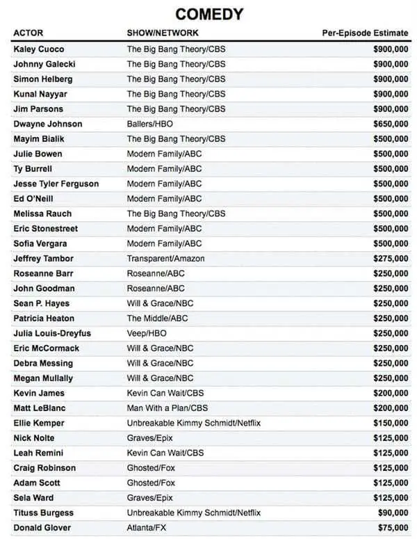 En comedia, todos los protagonistas de The Big Bang Theory concentran los primeros puestos: Kaley Cuoco, Jim Parsons, Johnny Galecki, Simon Helberg y Kunal Nayyar, cada uno ganó USD 900.000 por episodio. Le sigue el actor Dwayne "La Roca" Johnson por Ballers, con USD 650.000, y detrás de él figuran varias estrellas de Modern Family con USD 500 mil capítulo.