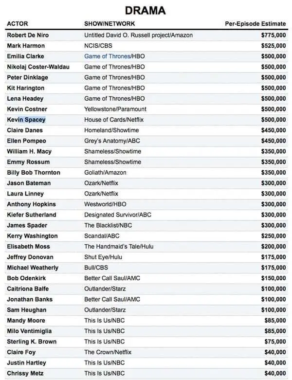 En el ranking de los actores mejores pagos de TV figuran varios protagonistas de Game of Thrones, el éxito de la cadena HBO: Emilia Clarke, Nikolaj Coster-Waldau, Peter Dinklage, Kit Harington y Lena Headey, cada uno factura USD 500 mil por capítulo.