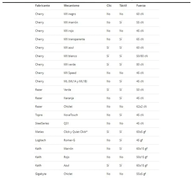 Estos mecanismos de los teclados son los más conocidos y extendidos en el mercado. Se dividen en 5 tipos distintos que se distinguen por colores.