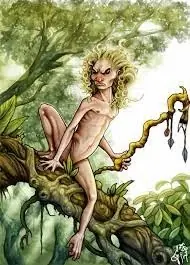 44. El Curupí (Formosa). Quinto hijo de Kerana y Taú, el Curupí es un individuo antropófago representado con grandes bigotes que anda en cuatro pies y con un miembro viril de tamaño exagerado. También se lo describe como un enano robusto con los pies dirigidos hacia atrás, por lo que le es difícil trepar y andar. Tiene la apariencia de un hombre más bien bajo, fornido, muy moreno y retacón, con manos y pies velludos.