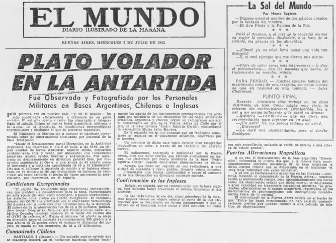 1. OVNIS sobre base antártica argentina (Base Decepción-Antártida). Era una noche clara y de cielo estrellado, con escasa nubosidad, en la base naval argentina Decepción, situada en la isla homónima. El 3 de julio de 1965, un grupo constituido por 17 personas fue testigo del avistamiento de un extraño objeto luminoso en el cielo. Este acontecimiento marcó el inicio de la investigación del fenómeno OVNI en nuestro país.